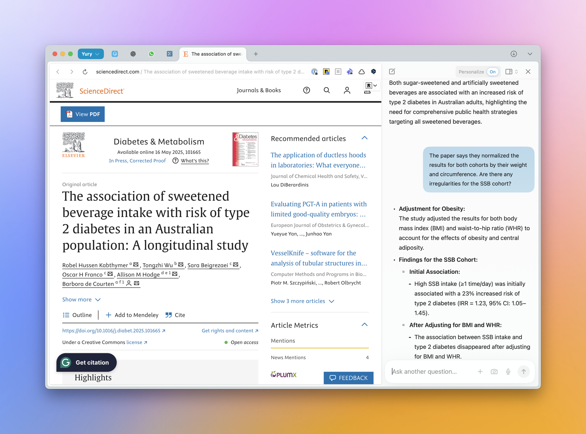 Atlas feels most like ChatGPT ported into a browser. The ChatGPT sidebar is omnipresent, and the product explicitly markets itself as "the browser with ChatGPT built in." If you already live in ChatGPT, this is frictionless. If you don't, it feels like ChatGPT keeps interrupting your browsing.