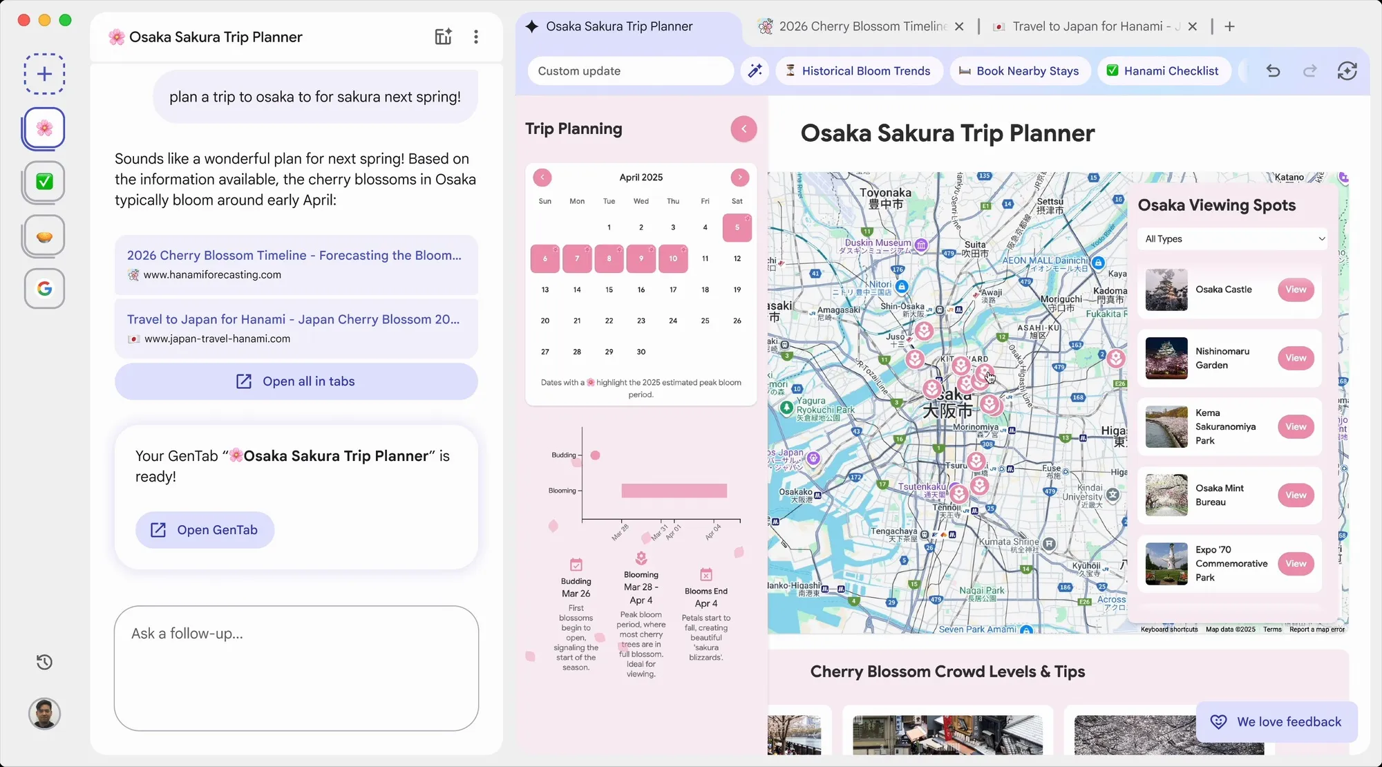 The star feature is GenTabs, powered by Google's latest Gemini 3 model. Instead of showing you web pages, GenTabs analyzes your open tabs and chat history to build custom interactive web applications on the fly—without you writing a line of code. Planning a trip? GenTabs generates a dashboard with maps, calendars, and budget trackers. Researching recipes? You get a meal planner with shopping lists. Studying a topic? It creates 3D interactive visualizations. Every generated element links back to its original web sources.
