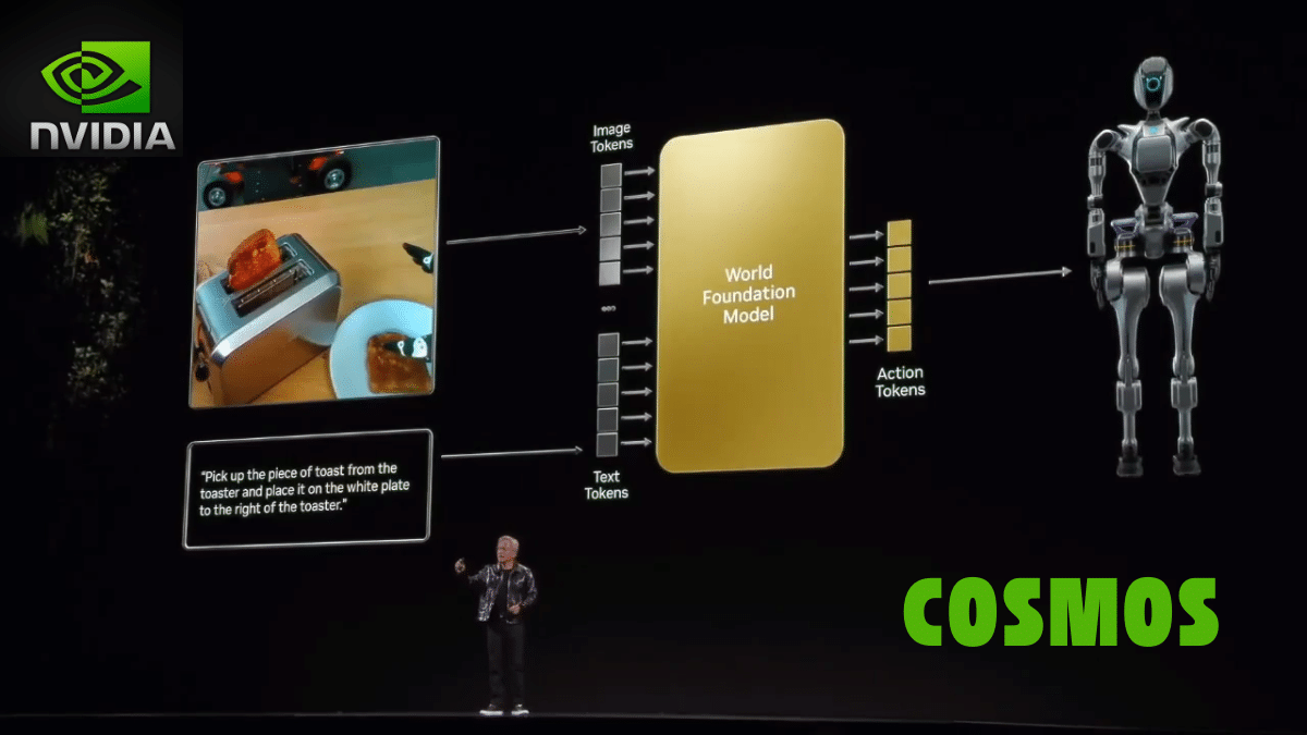 Nvidia's Cosmos platform generates physics-based videos from combinations of text, image, video, and robot sensor data, built for physically based interactions, object permanence, and high-quality generation of simulated industrial environments.