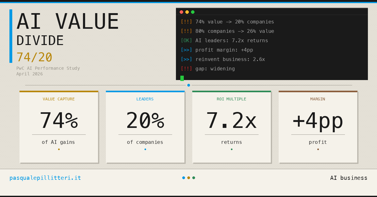 Most companies using AI are running pilots. A small group is running businesses that look fundamentally different from their competitors. According to PwC's 2026 AI Performance Study, released April 13, that split produces a stark result: 74% of AI's economic value is captured by just 20% of organizations.