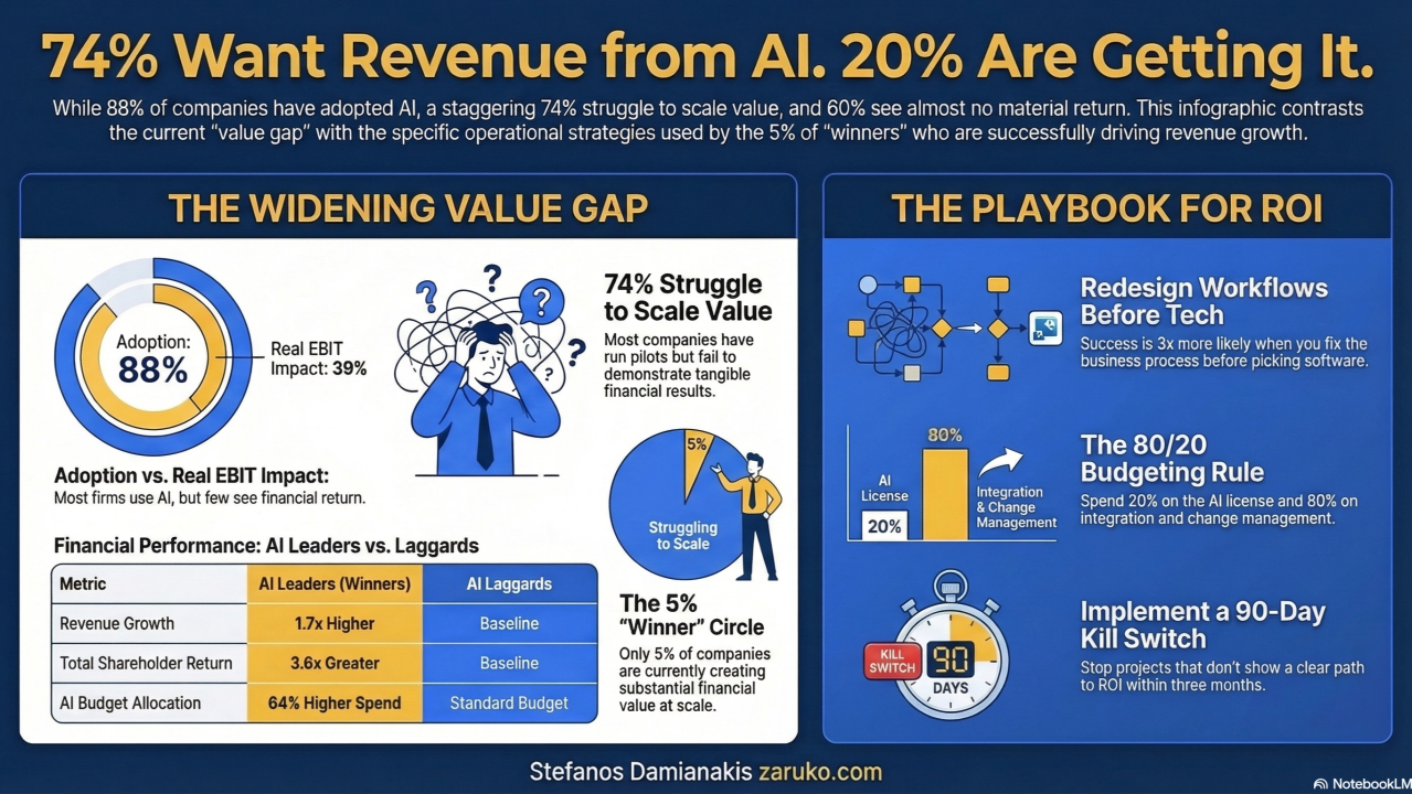 The 74/20 split in AI returns is not a technology failure but an organizational design and strategic orientation failure. The AI tools available to the leading 20% of companies are largely the same tools available to everyone else. What differs is whether those tools are pointed at operational efficiency, which many organizations share, or at growth and business model reinvention, which the majority have not yet attempted.