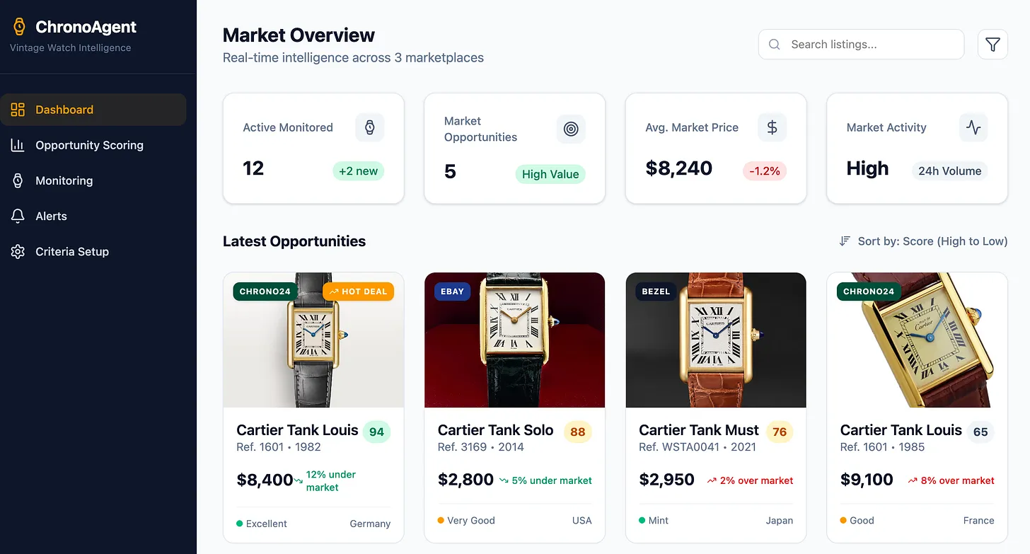I was trying to find the perfect gift for my wife: a vintage Cartier Tank. The problem was time. I simply could not keep up with the endless searching, comparing, and bidding across multiple vintage watch marketplaces.