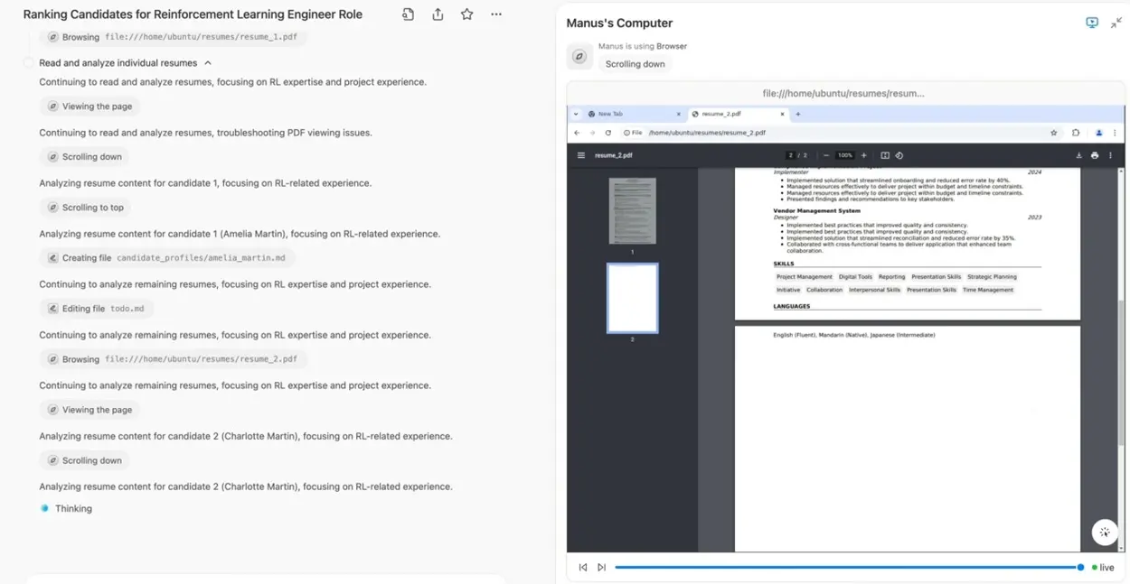 In testing, Manus performed impressively on structured tasks like compiling research lists, analyzing spreadsheets, and planning itineraries. The "Manus's Computer" window lets you observe what the agent is doing and intervene at any point, which provides useful transparency.