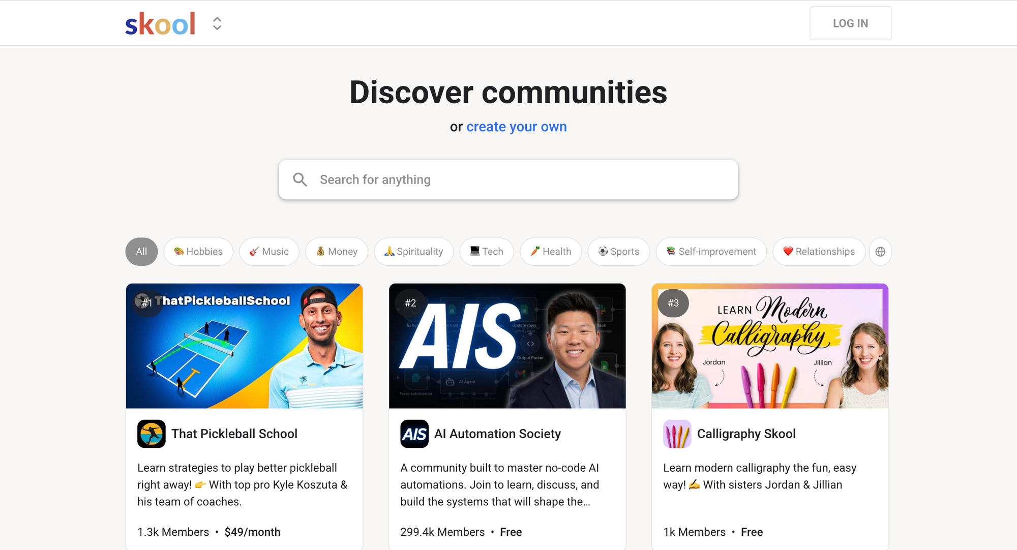 Skool occupies a different position in the market: simpler, cheaper, and more aggressively focused on gamification as an engagement driver. Founded by Sam Ovens and backed by Alex Hormozi, it had over 174,000 community creators by late 2024.