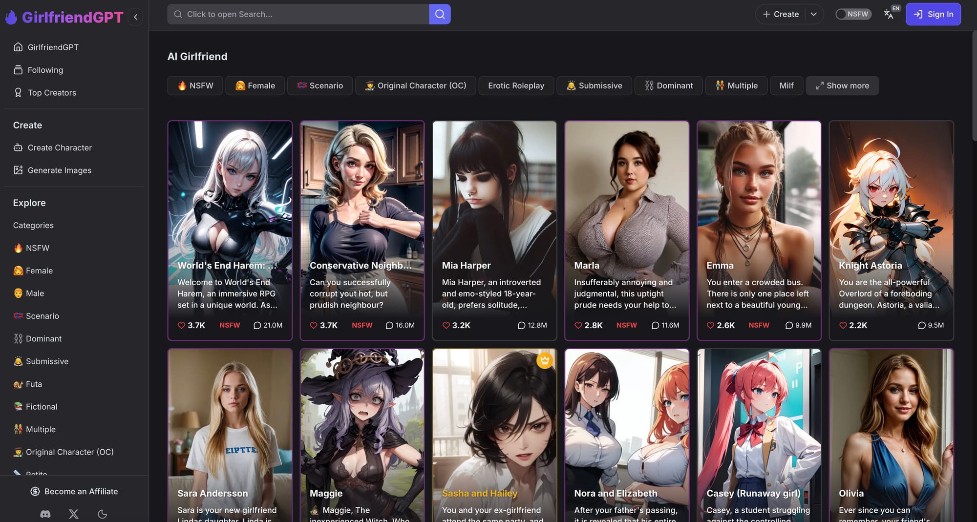 Best For: Variety seekers who want to explore hundreds of different AI companions without paying