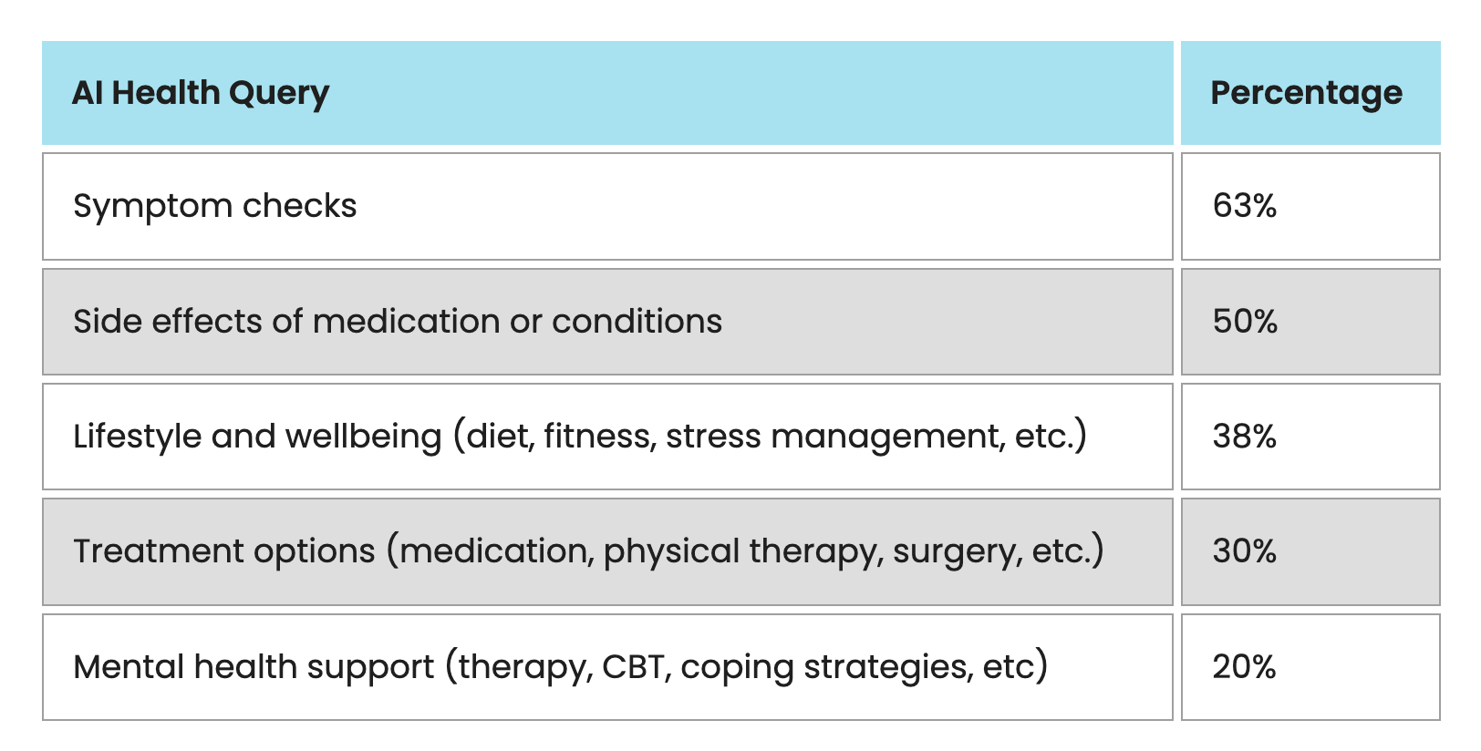 Symptom checks are the most common use, with 63% of AI health users searching for information about physical or mental symptoms they are experiencing. Side effects of medications follow at 50%. Wellbeing and lifestyle questions, covering diet and fitness, account for 38% of queries. Treatment options including medication information account for 30%. Mental health support, including therapy-adjacent queries and coping strategies, is sought by 20% of AI health users.