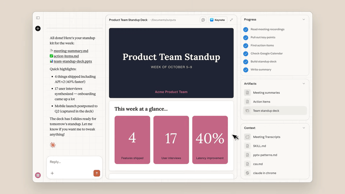 When given access to folders containing brand assets, context documents, or source materials, Claude can build slide decks automatically. The results include proper formatting, charts generated from data, and layouts that follow professional conventions. You can iterate on the design with follow-up instructions like "make this more visual" or "add a summary slide at the end."