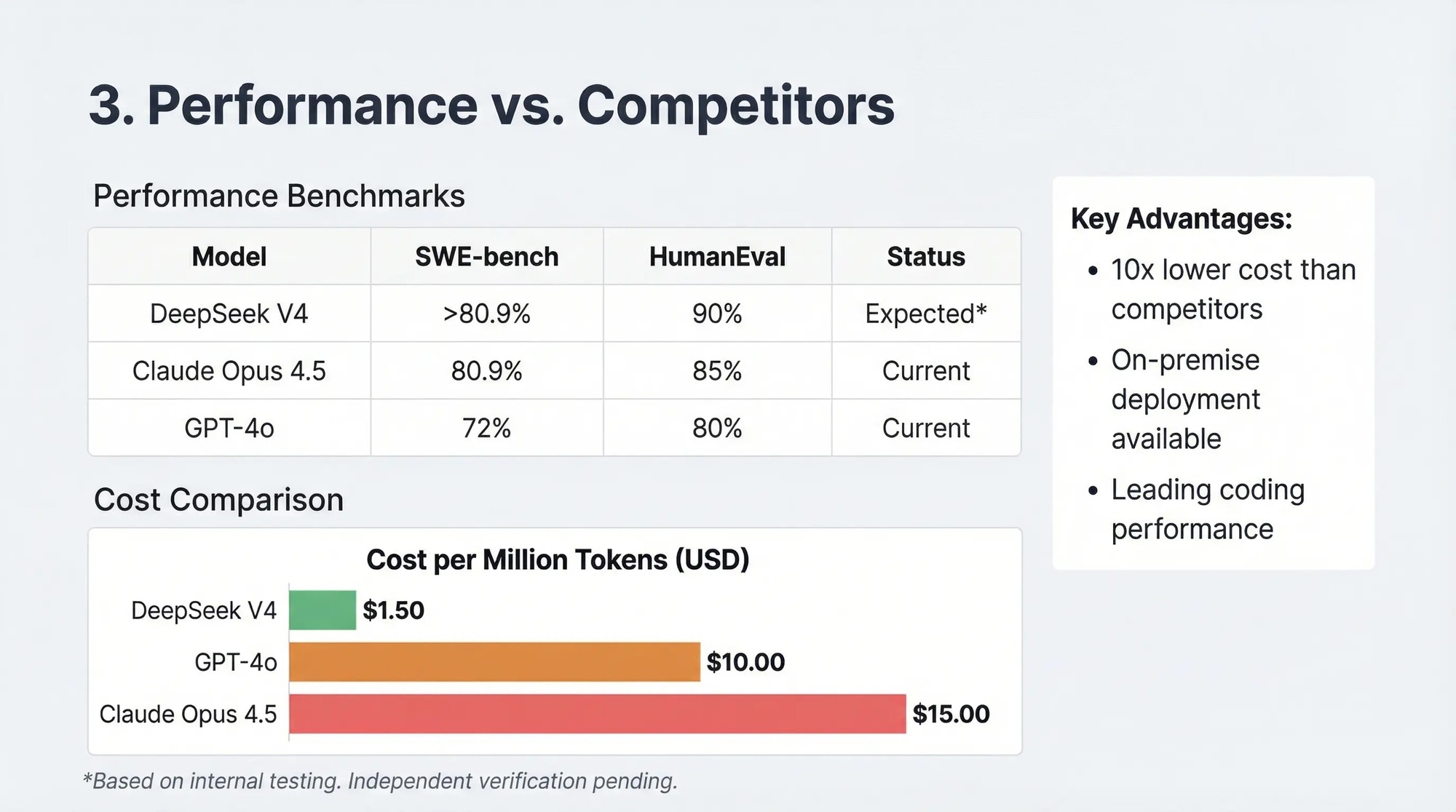 Internal testing reportedly shows V4 outperforming Anthropic's Claude 3.5 Sonnet and OpenAI's GPT-4o on coding benchmarks. While these claims remain unverified by independent testing, they align with DeepSeek's strategic focus.