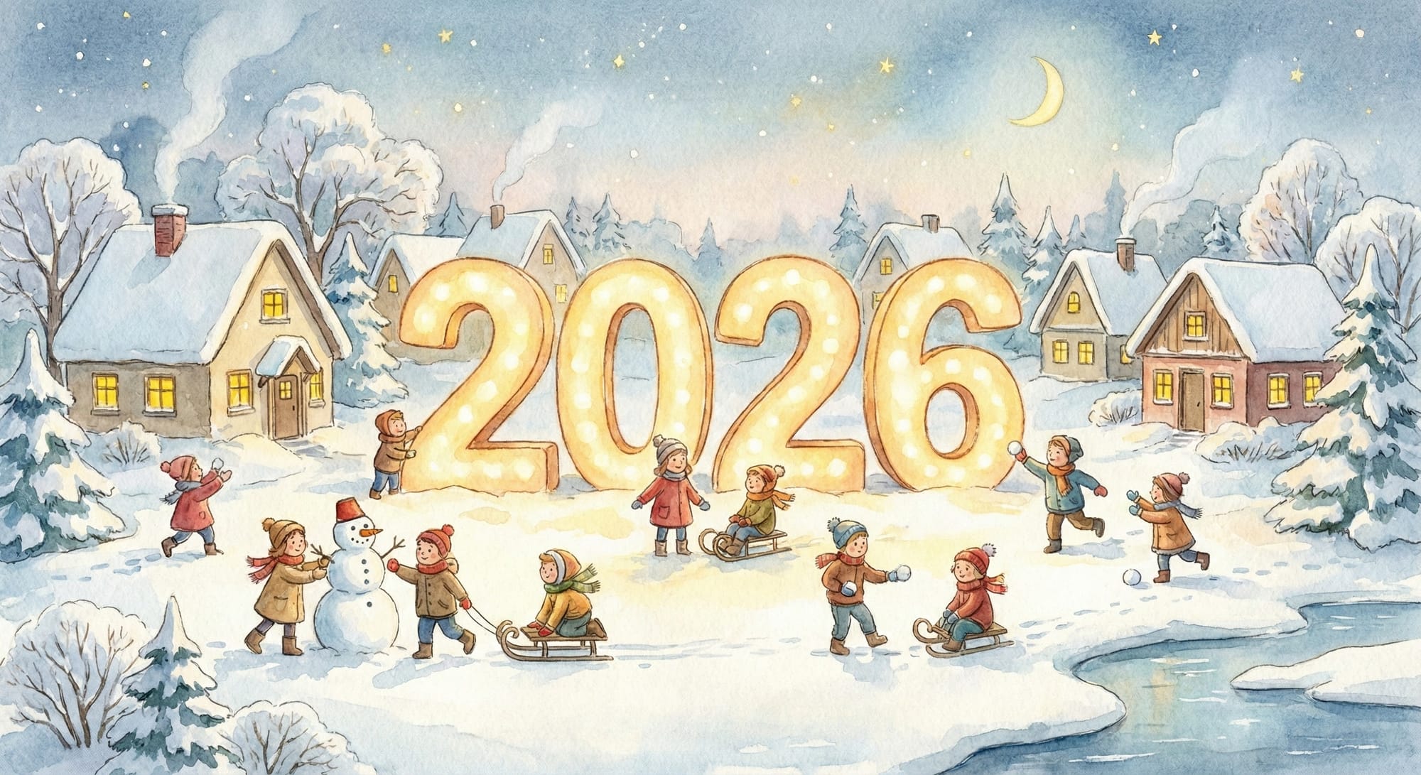 Prompt: “Cozy winter illustration New Year card, hand-painted watercolor style, whimsical snowy village around a huge glowing 2026 in the center, kids playing with snow, warm yellow lights in windows, soft pastel colors, textured watercolor paper, visible brush strokes, dreamy atmosphere, slightly foggy air, storybook illustration, 8K scan, ultra high resolution”