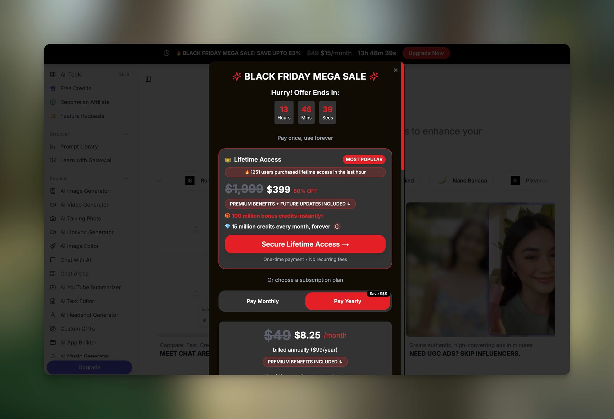 For most users exploring AI tools: Start with Galaxy.ai's annual plan ($15/month). The variety is unbeatable, and you'll discover tools you didn't know existed. Use the 14-day trial to confirm it fits your workflow.