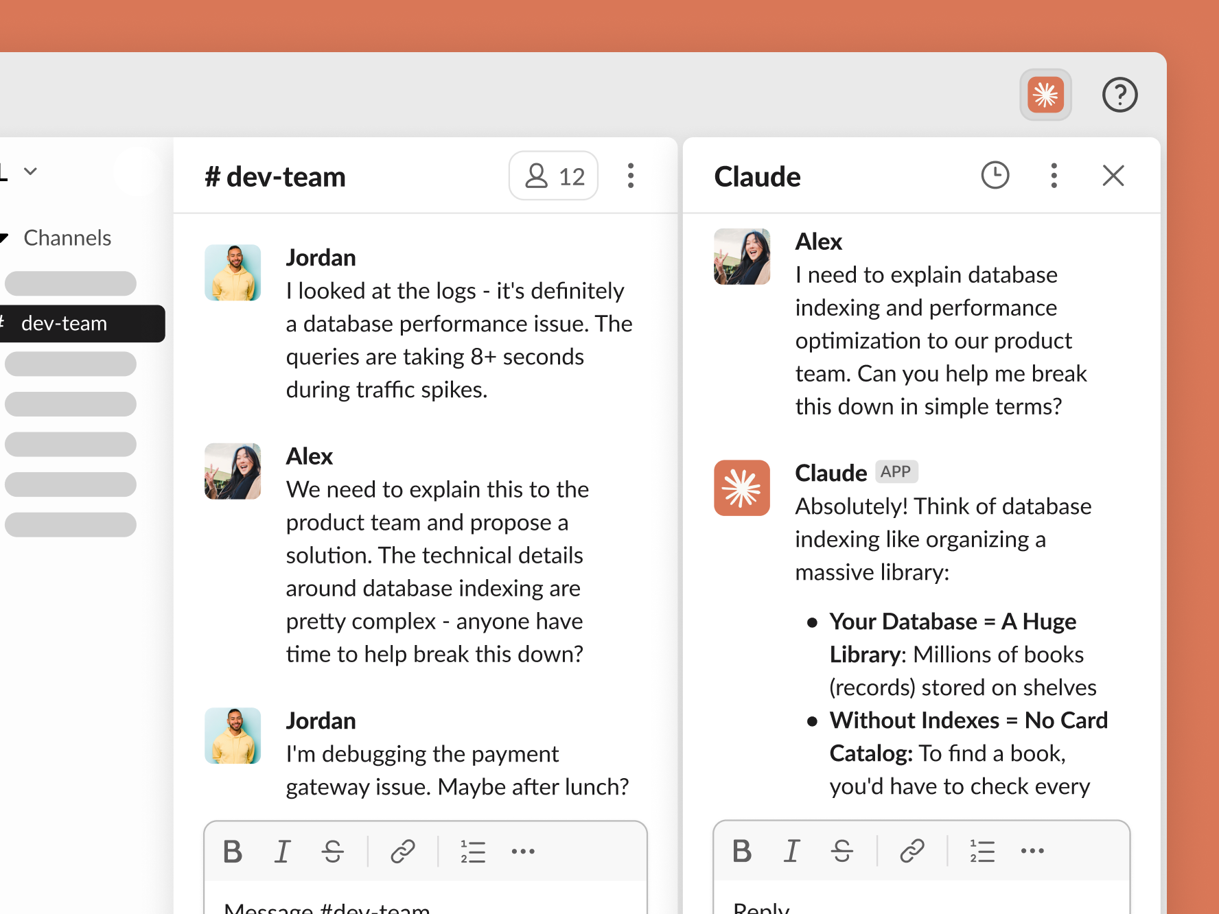 - Slack provides full two-way integration. You can use Claude directly within Slack via DMs or thread mentions, and you can connect Slack to Claude so it searches your workspace channels, messages, and files during conversations.