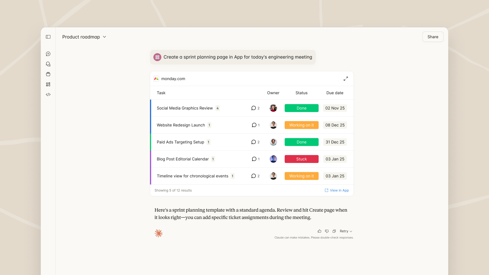 During a brainstorming session in Claude, you develop a project plan. Instead of manually creating tasks afterward, you say: "Create Asana tasks for each of these action items and assign them based on our previous project structure."