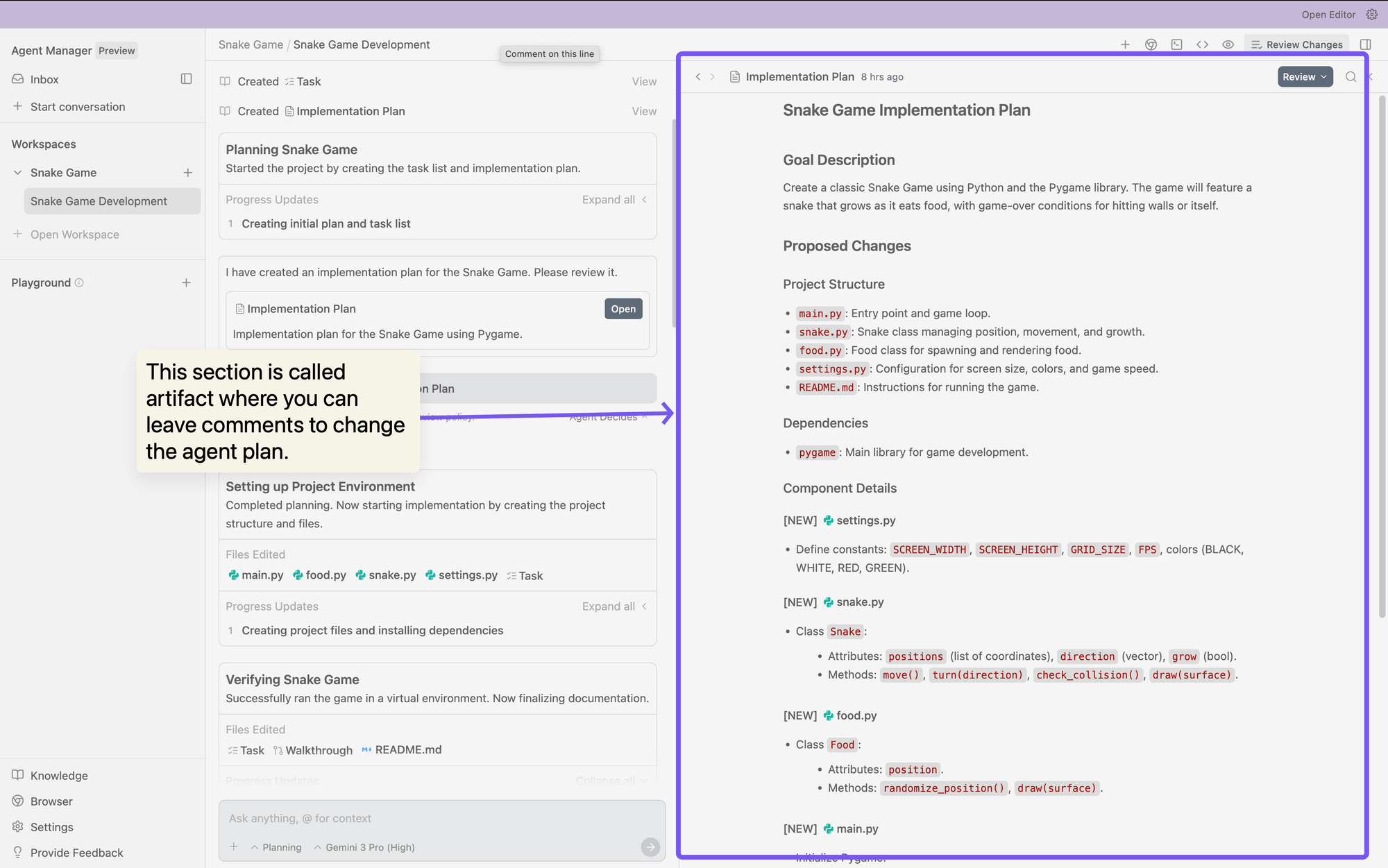 You can verify an agent's logic at a glance without parsing through hundreds of tool call logs. If something looks wrong, you leave feedback directly on the Artifact (like commenting on a Google Doc), and the agent incorporates your input without stopping execution. This asynchronous feedback loop is revolutionary for maintaining flow state.