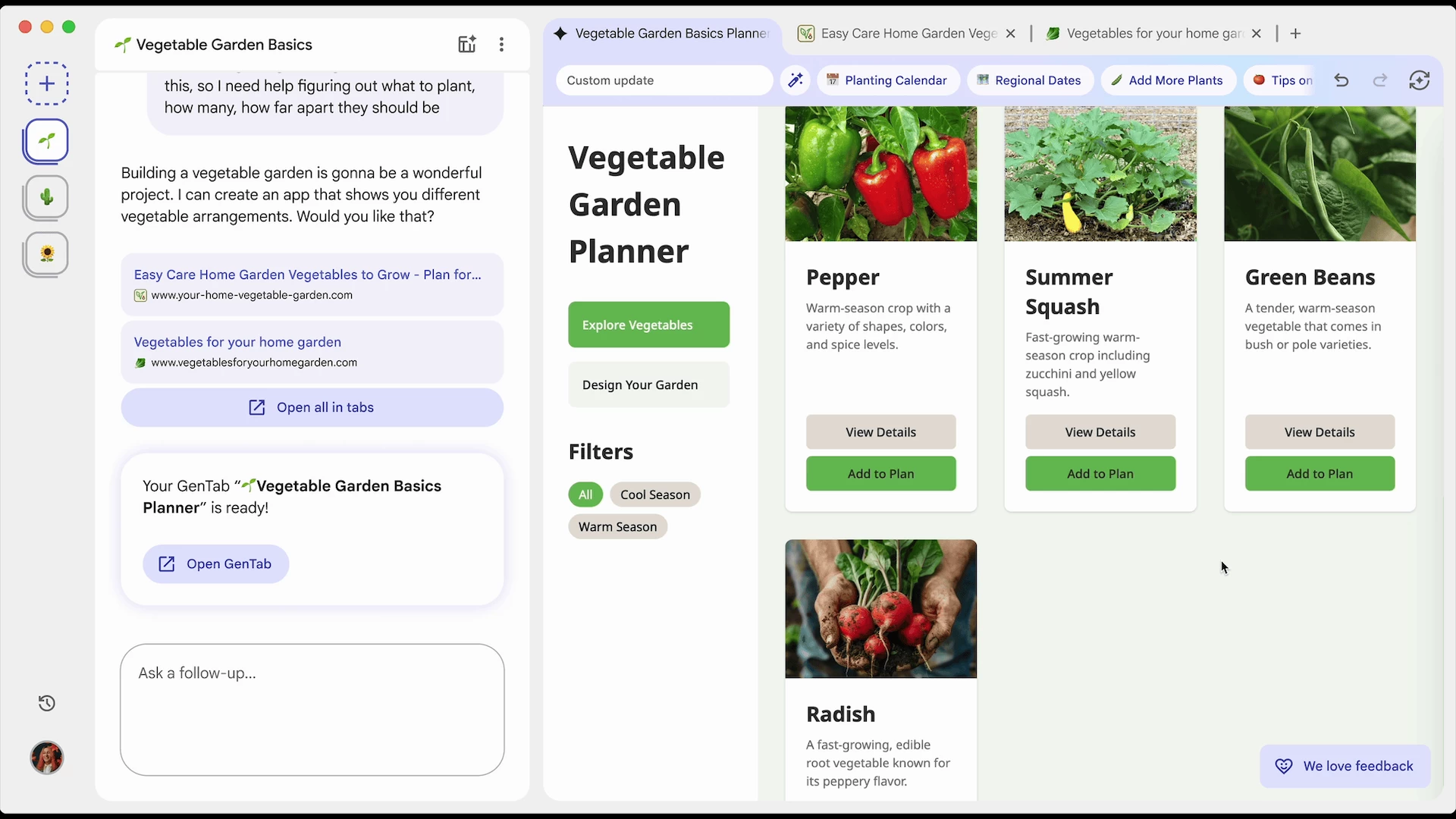 GenTabs is also useful for shopping and decision-making, as it can compare products, prices, specifications, and reviews in one unified view. For students and researchers, it helps turn scattered sources into structured study aids, summaries, or comparison tables. Beyond that, it can assist with practical planning tasks such as gardening schedules or financial planning by creating calculators and visual planners. Overall, GenTabs helps users move from browsing many tabs to actively building structured, interactive solutions for everyday needs.