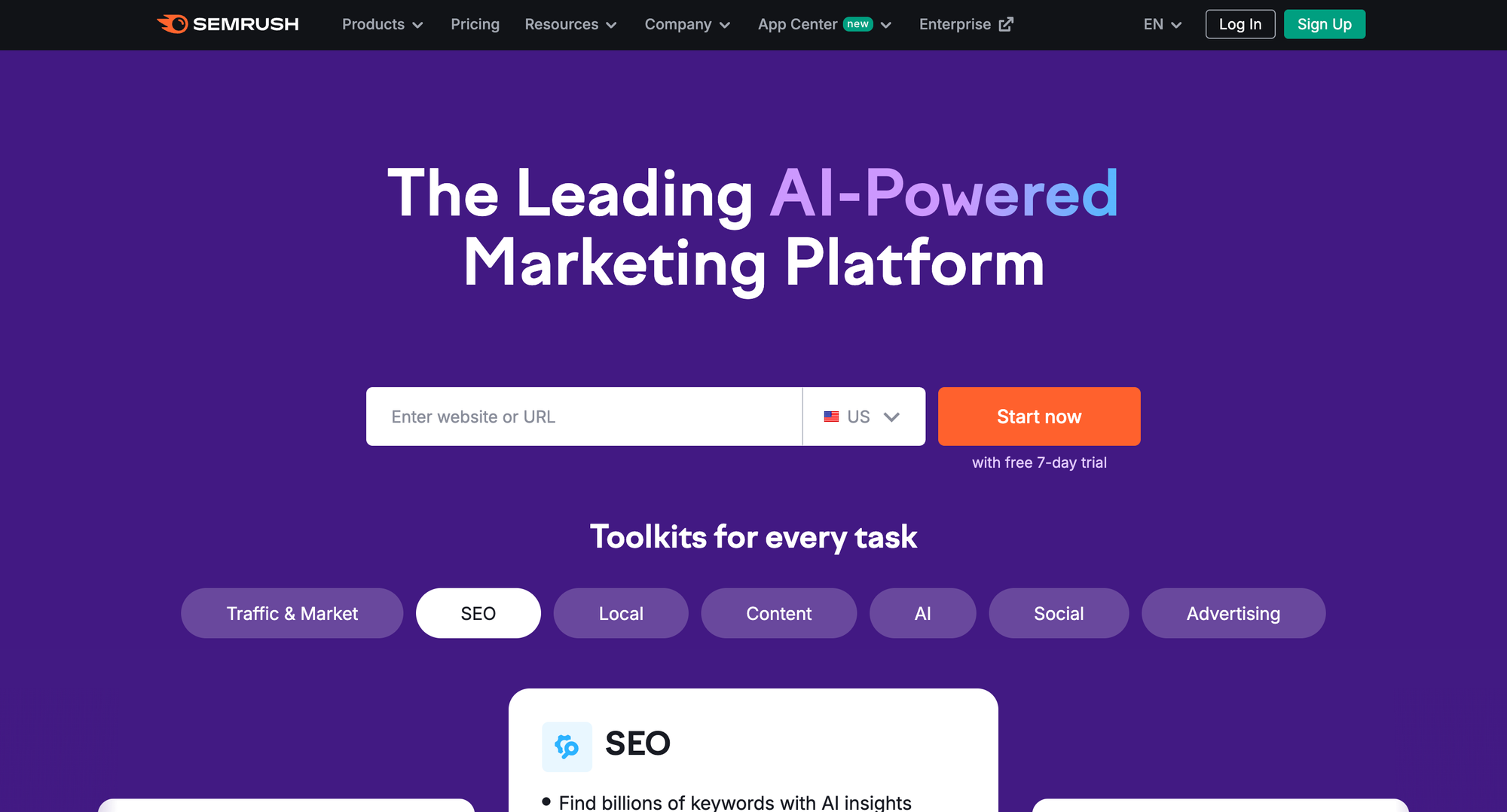 Semrush is one of the most versatile SEO AI tools, offering an extensive AI-powered SEO strategy that covers keyword research, technical audits, content optimization, and paid advertising insights.