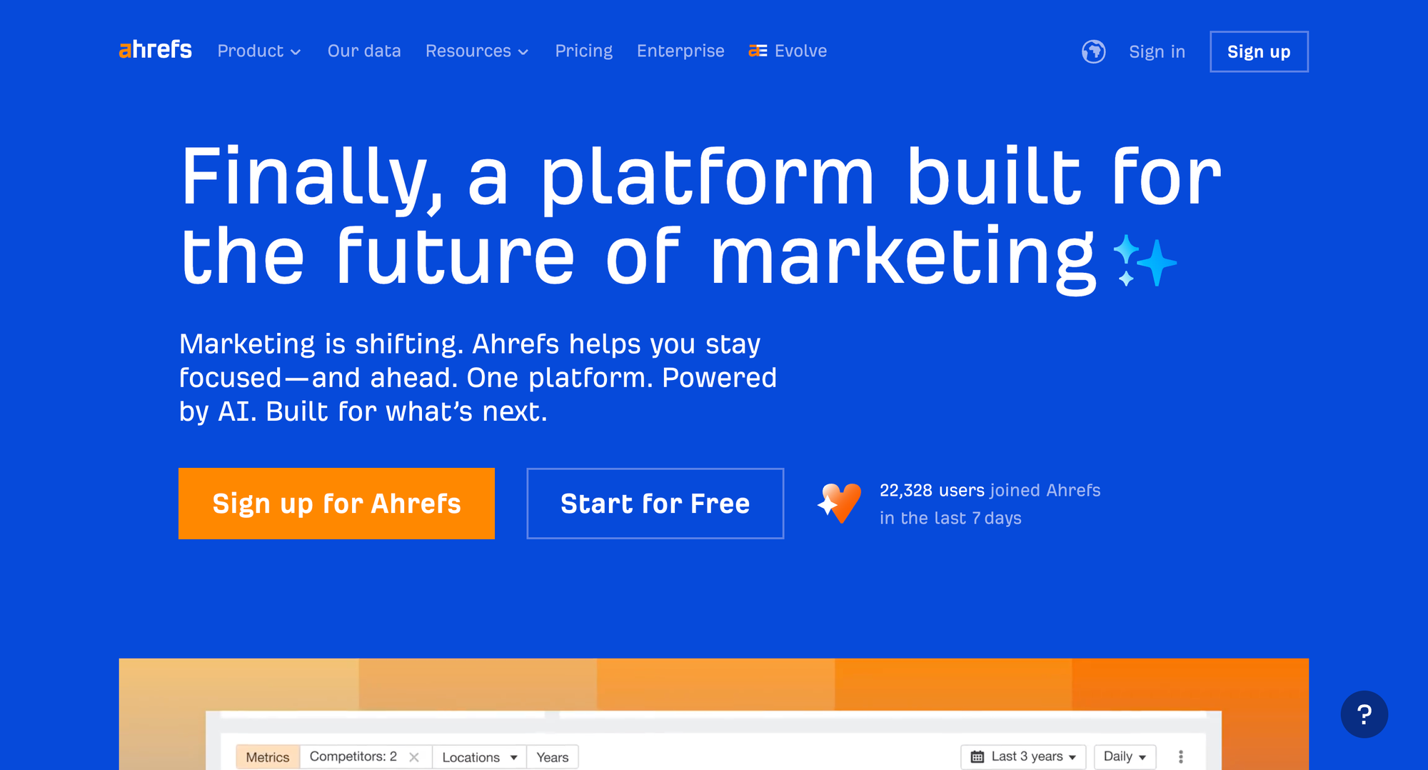 Ahrefs is widely recognized as one of the most comprehensive SEO AI tools for backlink tracking, competitor research, and site audits.