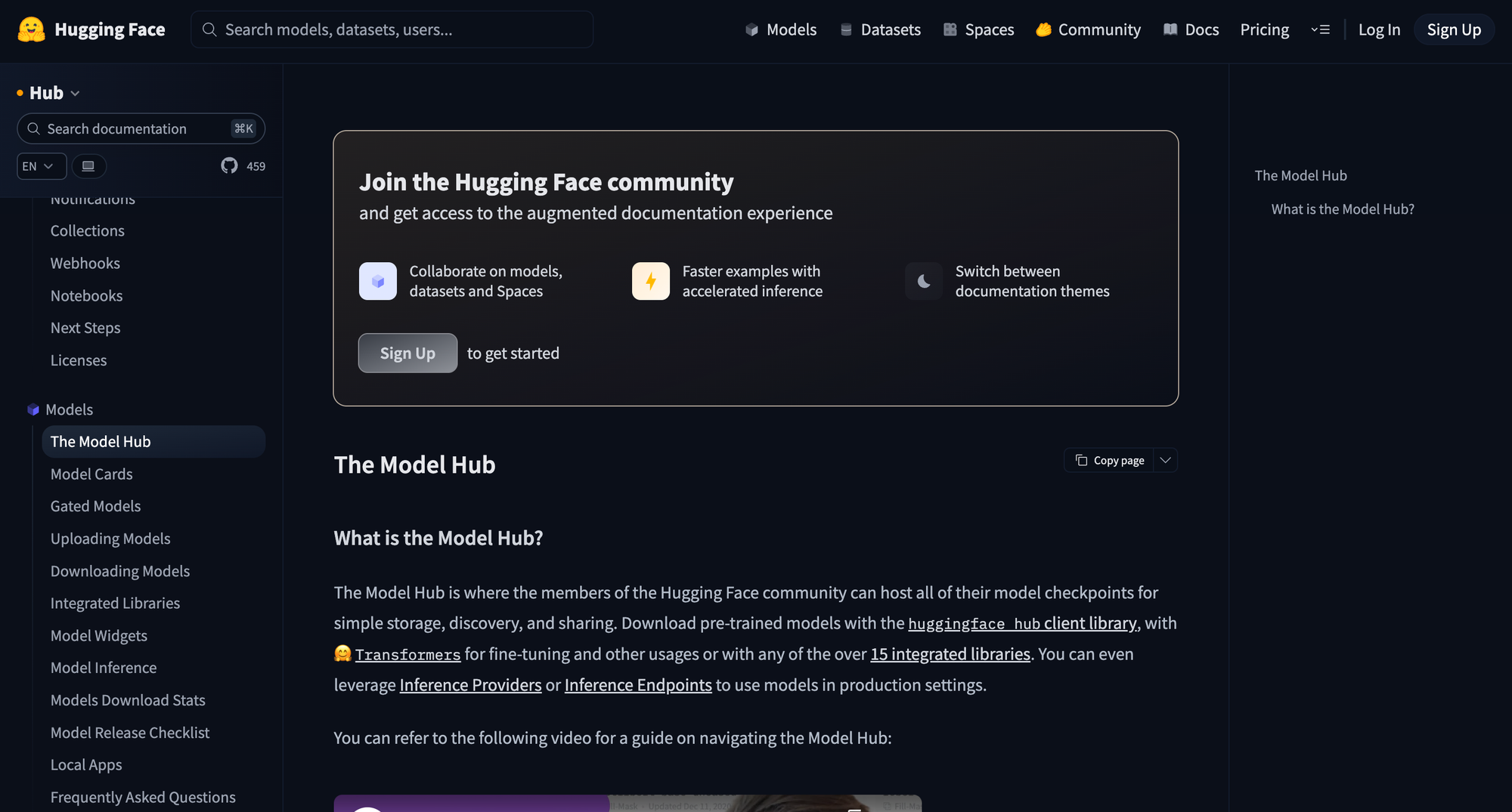 The Model Hub is the crown jewel of HuggingFace. You get free access to hundreds of thousands of pre-trained models. These include everything from small, efficient models that run on your laptop to larger models you can use through their API.