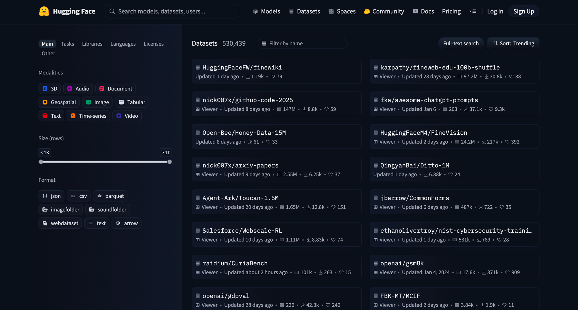 Access to over 100,000 datasets for training and testing models. These range from text corpora to image datasets to audio collections. You can download them freely, and many come with built-in tools for easy loading and processing.