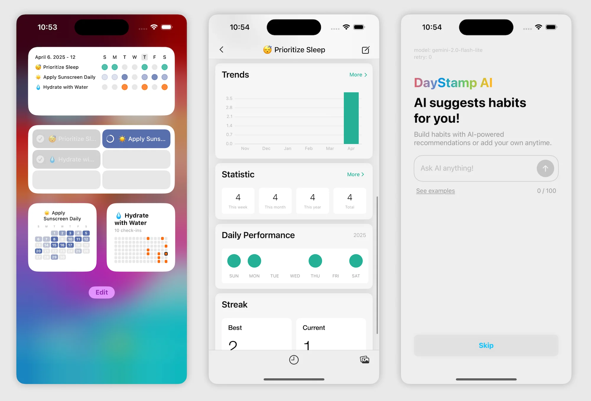The app needed to let users create habits they want to track, mark habits as complete each day, see a streak counter for each habit, view a weekly overview of their progress, and have their data persist across sessions.
