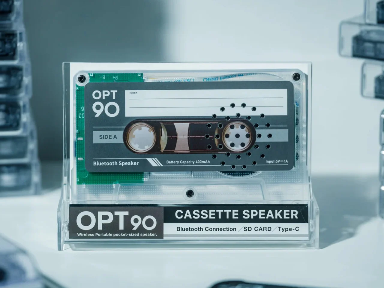 The Side A Cassette Speaker captures that spirit in a Bluetooth speaker that looks exactly like a transparent mixtape, complete with Side A labeling and visible "reels" inside the clear shell. The see-through design directly references the transparent electronics that defined 90s youth culture — see-through phones, see-through Game Boys, see-through everything.