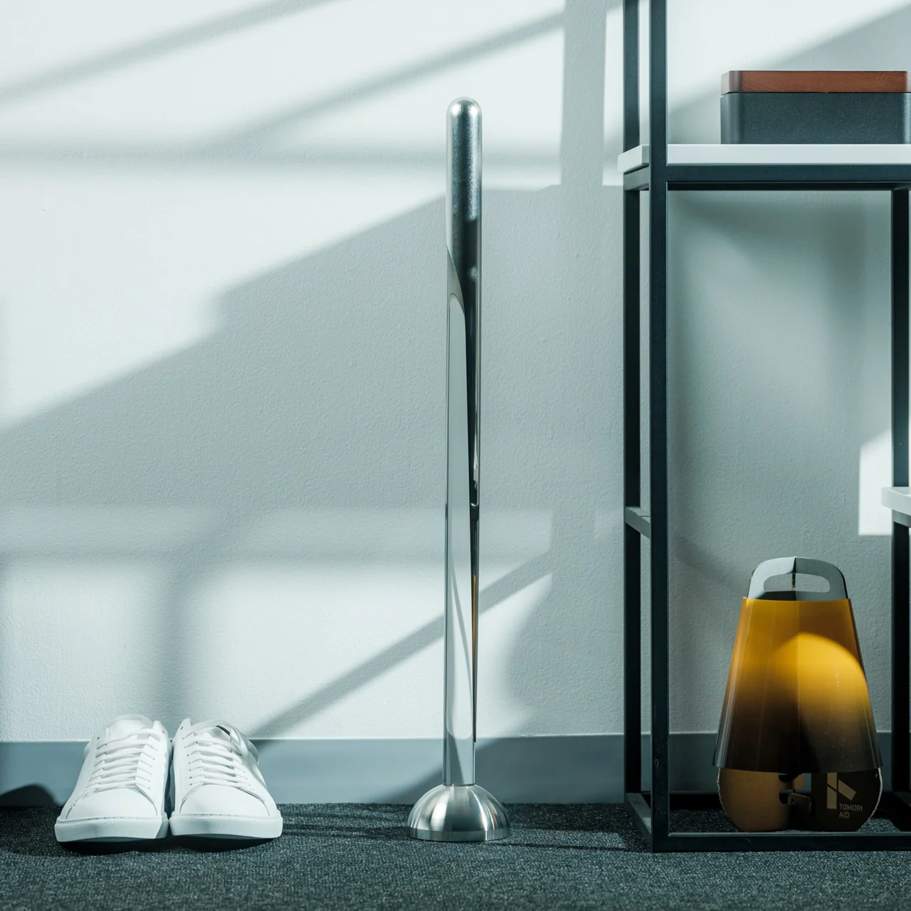 The Invisible Shoehorn is a long stainless steel shoehorn with a transparent acrylic stand. When displayed, it looks sculptural, like a piece of modern art rather than a utilitarian object. The polished steel surface glides smoothly without snagging socks. The long handle eliminates back strain when putting on shoes — a small daily relief that compounds over years of use.