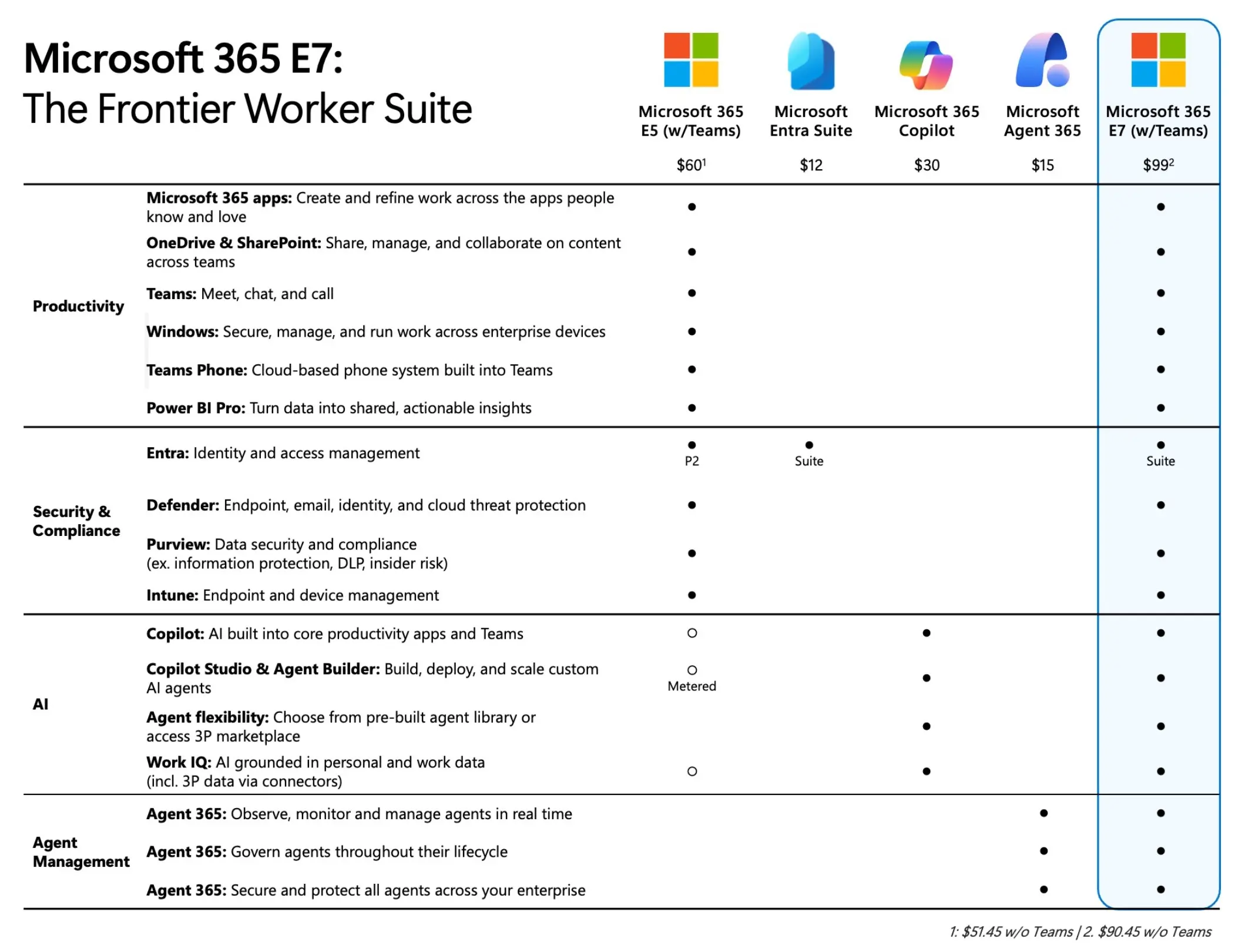 Microsoft 365 E7, launching May 1, 2026, at $99 per user per month, bundles Microsoft 365 E5, Microsoft 365 Copilot, the Entra Suite for identity management, and Agent 365, a new governance platform for managing AI agents across an organization. Buying these components separately would cost approximately $117 per user per month. Paid Copilot licenses currently represent only about 3% of Microsoft's commercial user base.