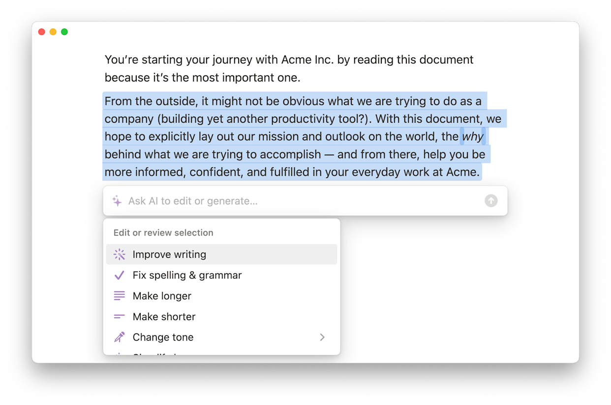 Improving existing text - Select any paragraph and ask the AI to make it longer, shorter, simpler, or more professional. This feature saved me countless hours when I needed to adjust tone for different audiences.