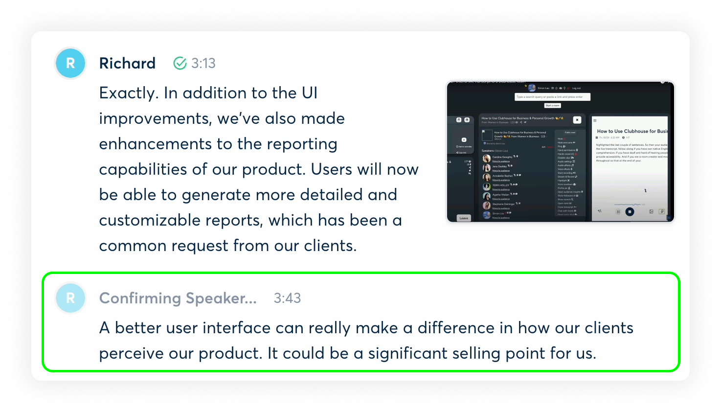 Why it matters: This feature is crucial for confirming details. When something seems off in the transcript, you can quickly verify what was actually said.