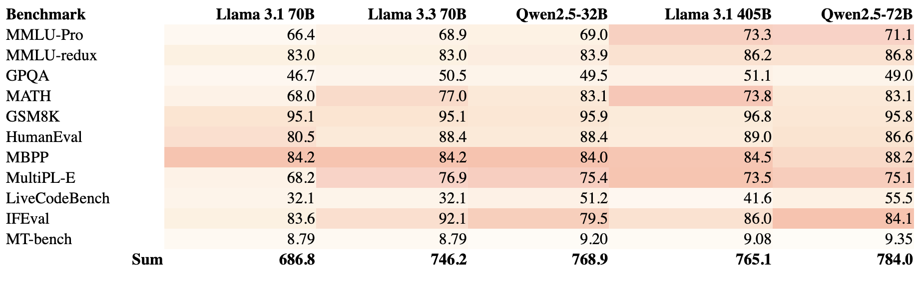 Where things get interesting is on MMLU Pro, a more challenging version of the test. Llama 3.3 scores 68.9 here, which beats its predecessor (Llama 3.1 70B at 66.4) but still trails some of the larger models. Qwen holds its own in this territory as well.