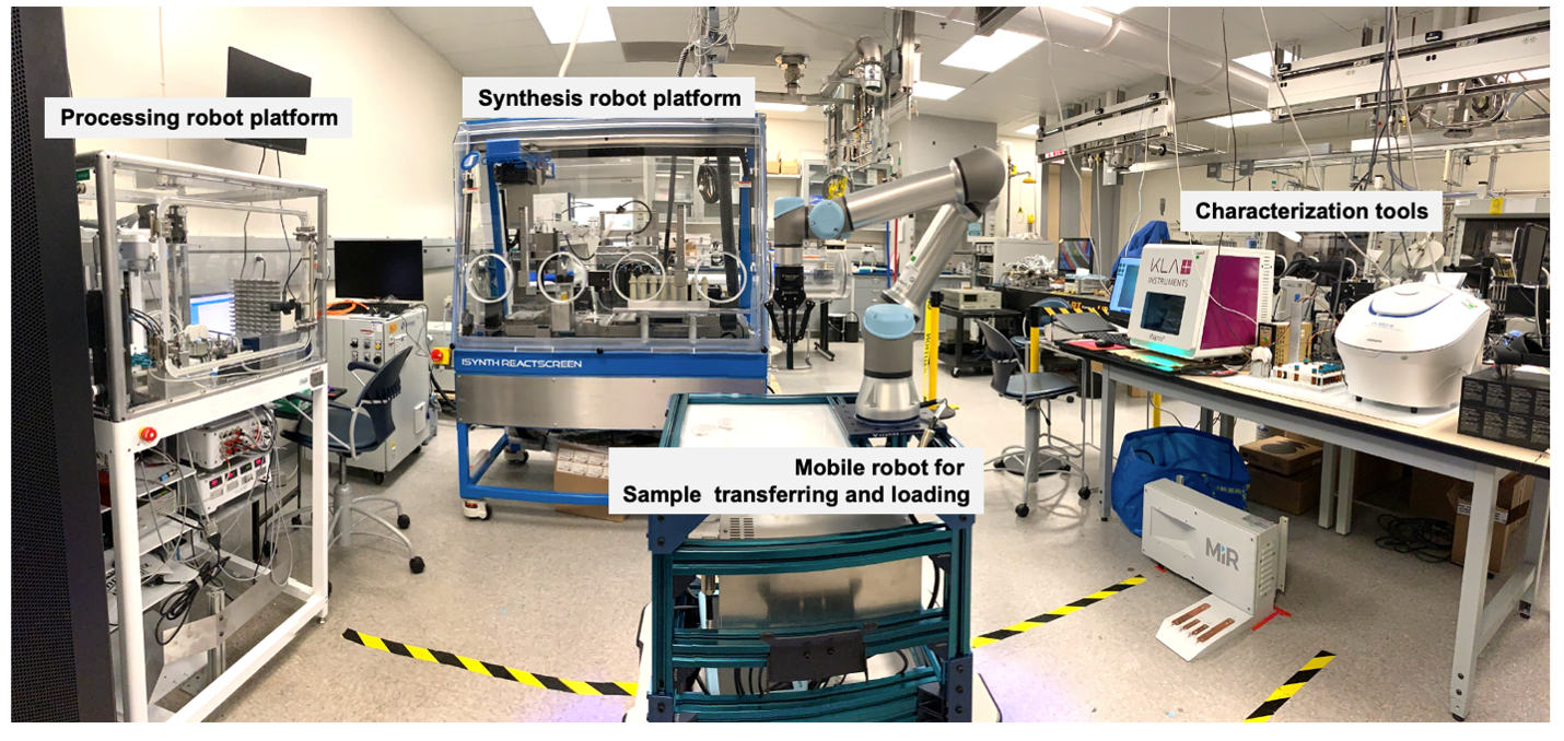 Polybot at Argonne National Laboratory is the most documented US example of a fully closed-loop self-driving lab in operation. The system consists of three robots (one synthetic, one for processing, one mobile for transporting samples), analytical instruments, and machine learning software that analyzes results and adjusts parameters for the next round.