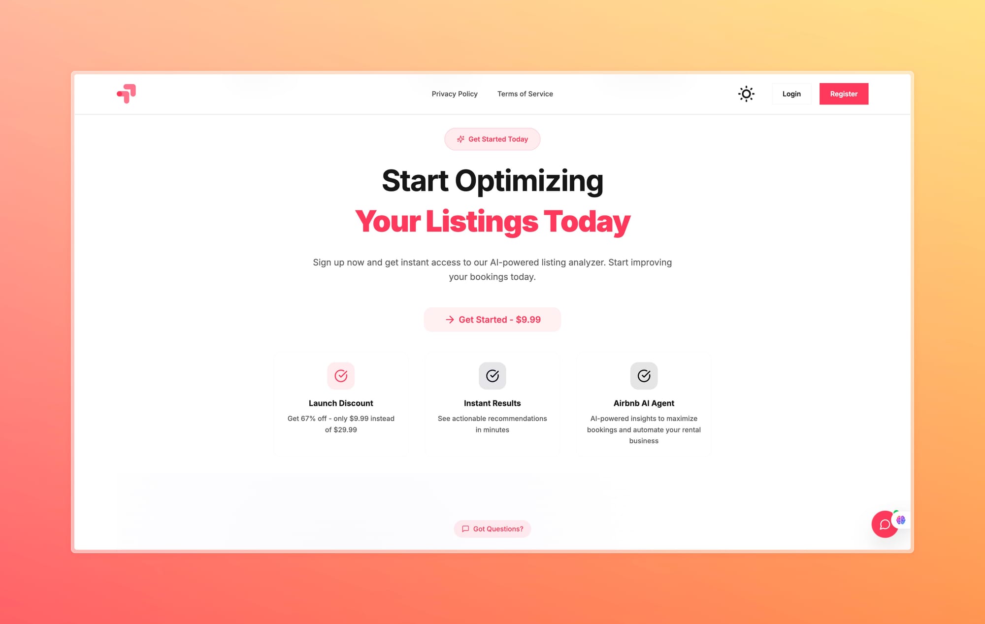 AI-Powered Listing Analyzer (Available Now) The core feature that instantly scans your Airbnb URL and delivers comprehensive optimization insights across SEO, pricing, photos, amenities, and description storytelling. Results appear in minutes with specific, actionable items ranked by potential impact.
