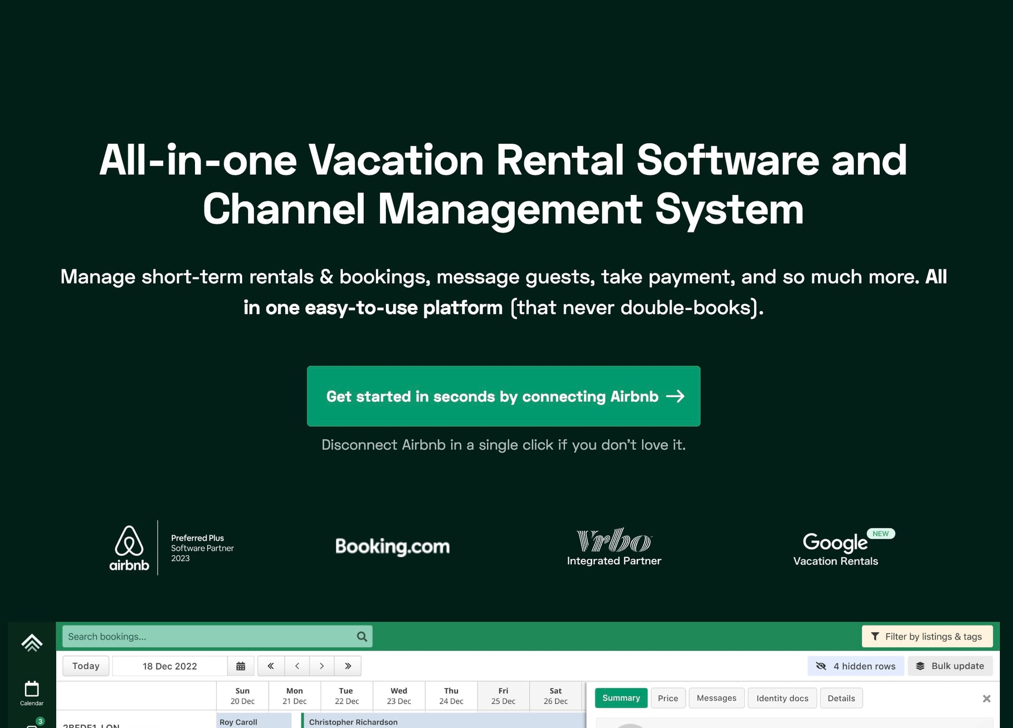 - Key Features: Multi-platform listing management, unified calendar, automated messaging, channel management
