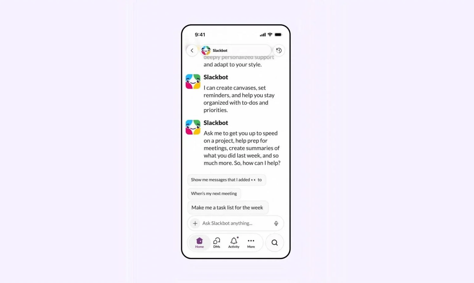 Slackbot handles scheduling by checking calendars, surfaces priorities based on your communication patterns, and sets reminders. For Salesforce customers, it can pull CRM data to generate customer briefings that combine account history with recent Slack discussions.