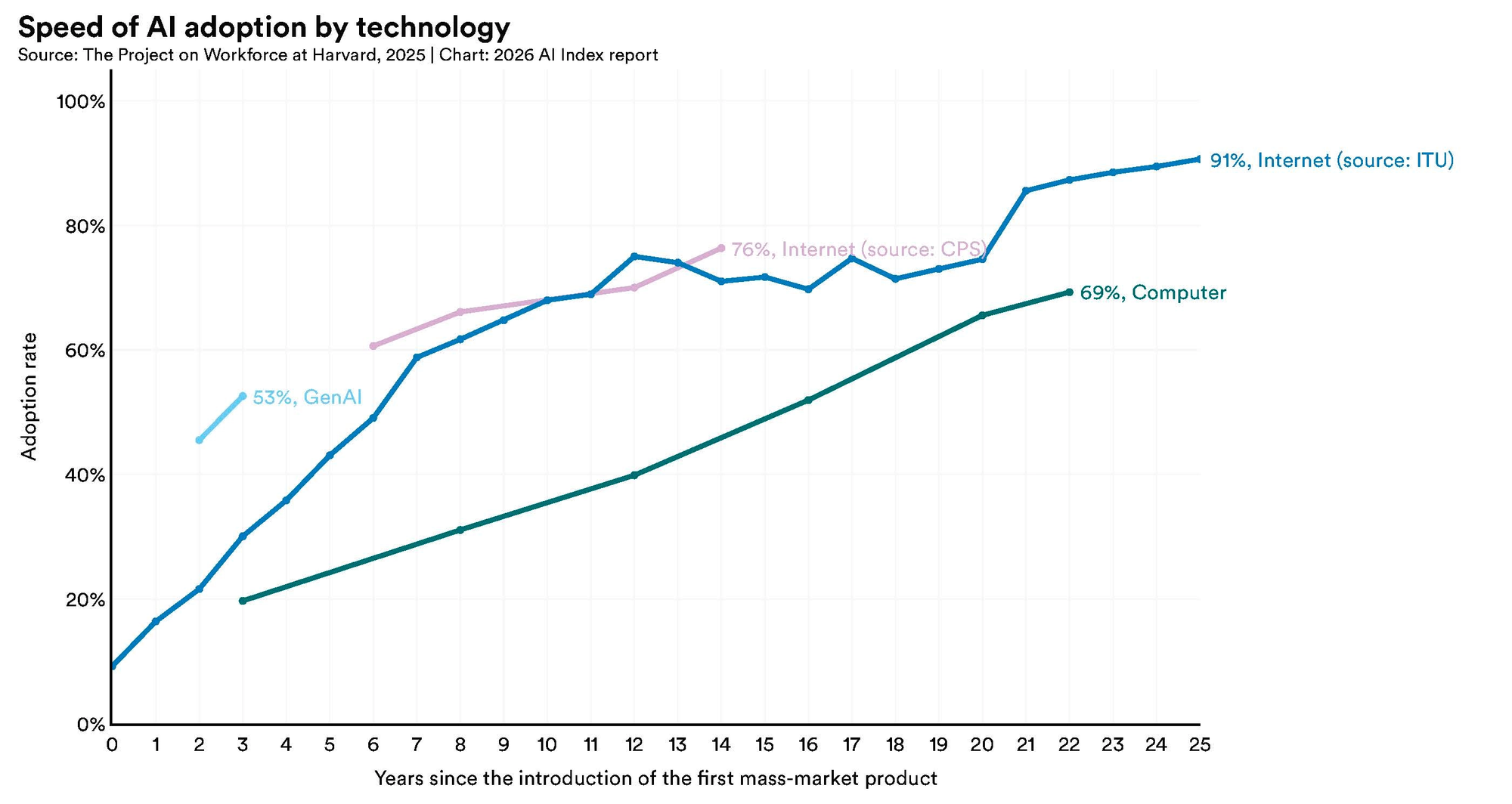 Despite this, the estimated value of generative AI tools to US consumers reached $172 billion annually by early 2026, with the median value per user tripling between 2025 and 2026. Generative AI reached 53% global population adoption within three years, faster than the personal computer or the internet.