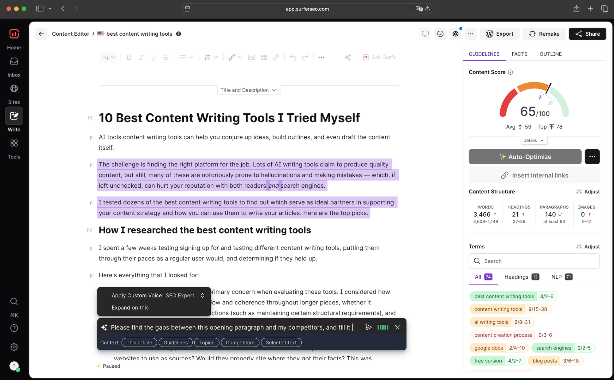 Real-time optimization: As you write, Surfer suggests specific sentences or paragraphs to add, recommending content that fills gaps compared to top-ranking articles.
