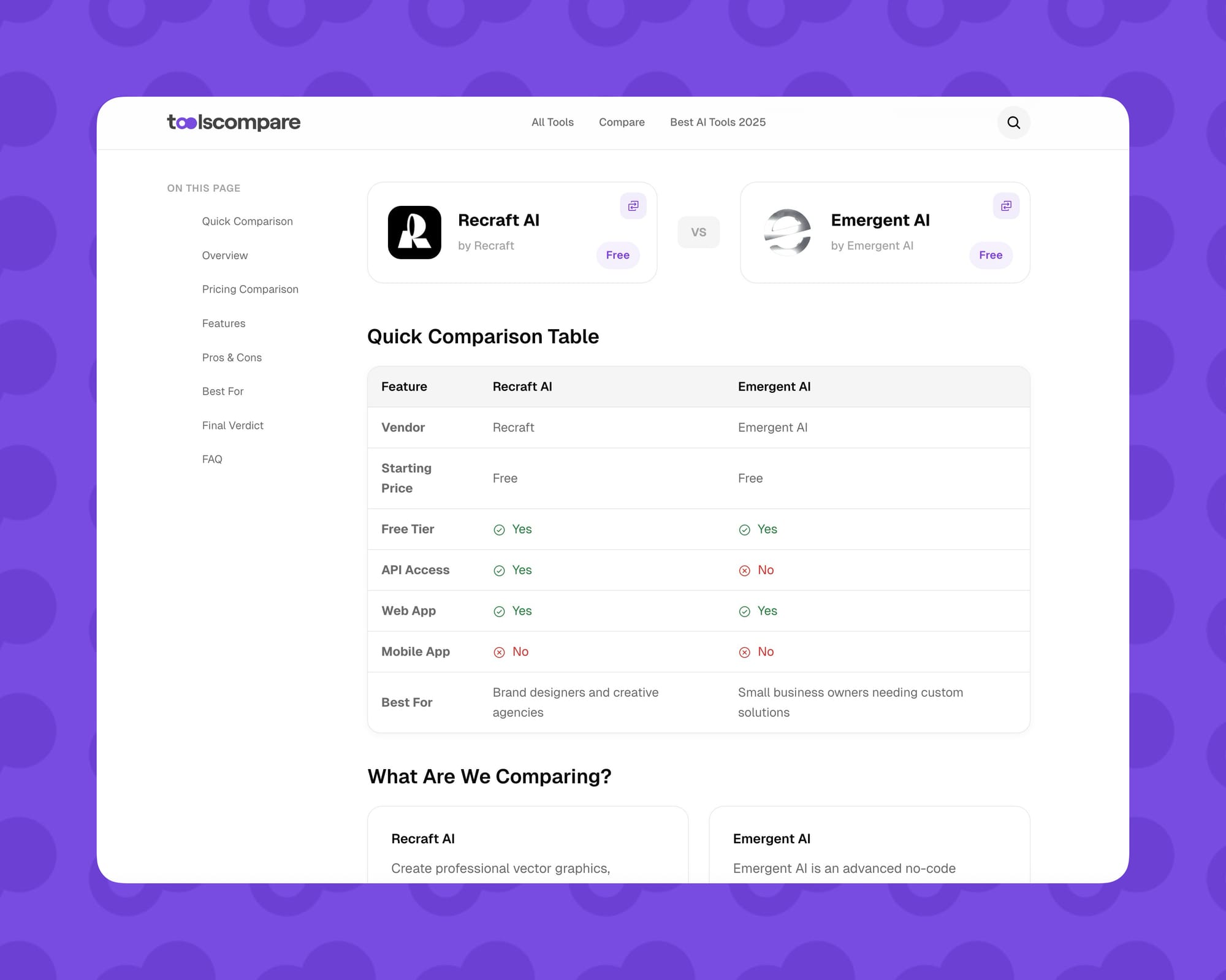 ToolsCompare.ai is a free comparison platform that puts AI tools head-to-head, giving you honest, data-driven insights on pricing, features, and real-world capabilities. No fluff. No hidden ads. Just the information you need to pick the right tool for your workflow.