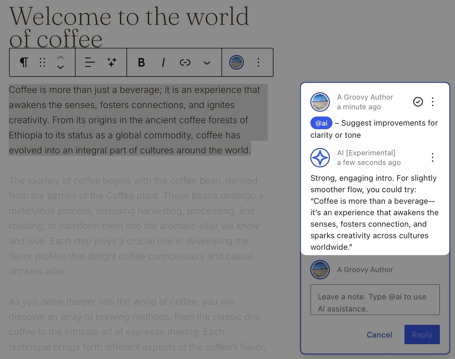 This makes the assistant genuinely useful for editorial teams — not just solo site owners — where content review and refinement happen collaboratively inside the editor rather than in a separate document or messaging thread.
